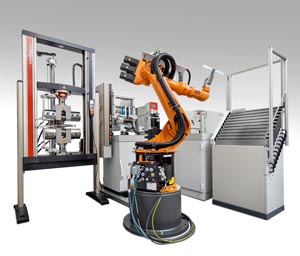 ZwickRoell, Januar 2022. Roboter-Prüfsysteme roboTest von ZwickRoell erlauben die vollautomatische Durchführung von Zug- und Härteprüfungen an Metallen. Da Bedienereinflüsse wegfallen entsteht eine hohe Reproduzierbarkeit der Prüfergebnisse. An das System können mehrere Prüfmaschinen von typischerweise 50 bis 2.000 kN angeschlossen werden; beispielsweise eine AllroundLine Prüfmaschine mit dem Extensometer makroXtens für Zugversuche nach ISO 6892-1.